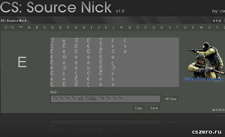 Полезная программа для генерации красивых ников в CSS. Данная программа содержит большое количество разнообразных символов, вводите их, копируйте ник, заходите в настройки игры и вставляйте туда свой новый, уникальный ник, который наверняка оценят все игроки сервера.